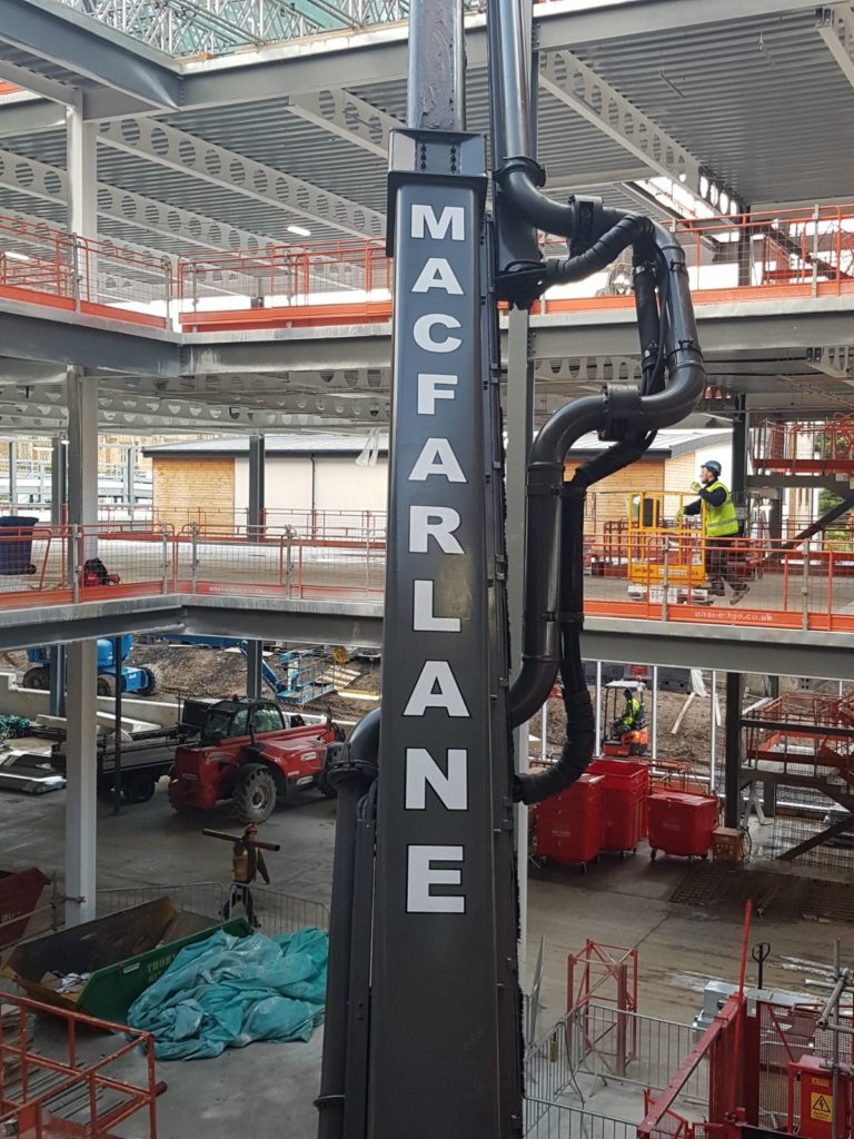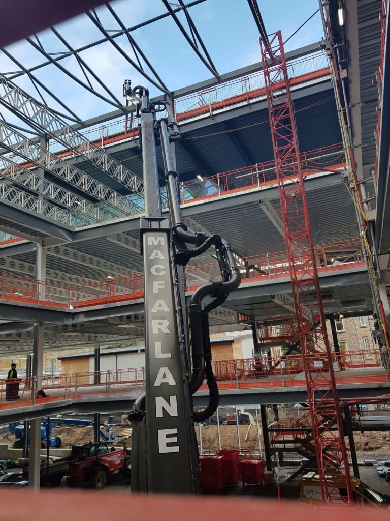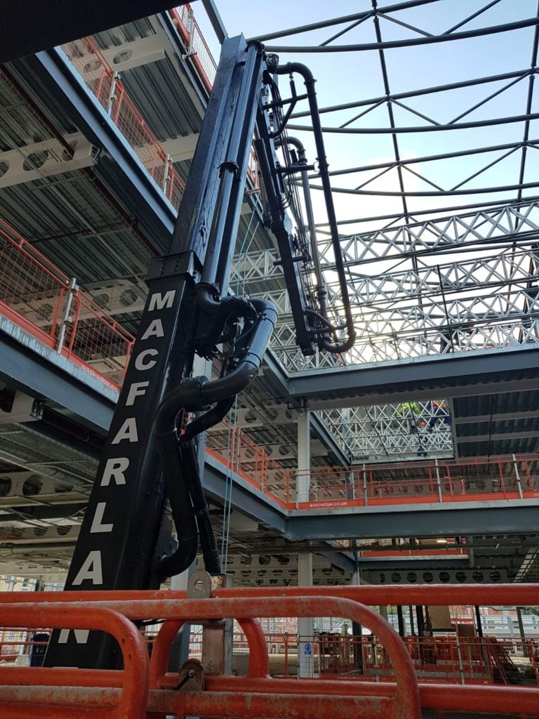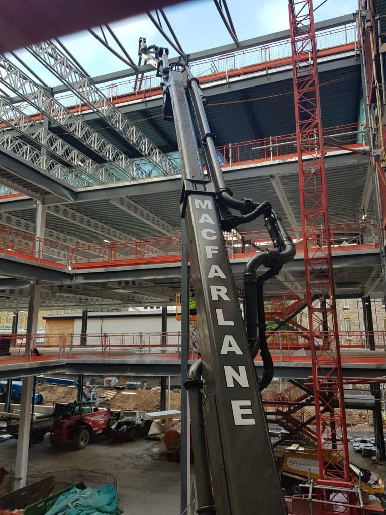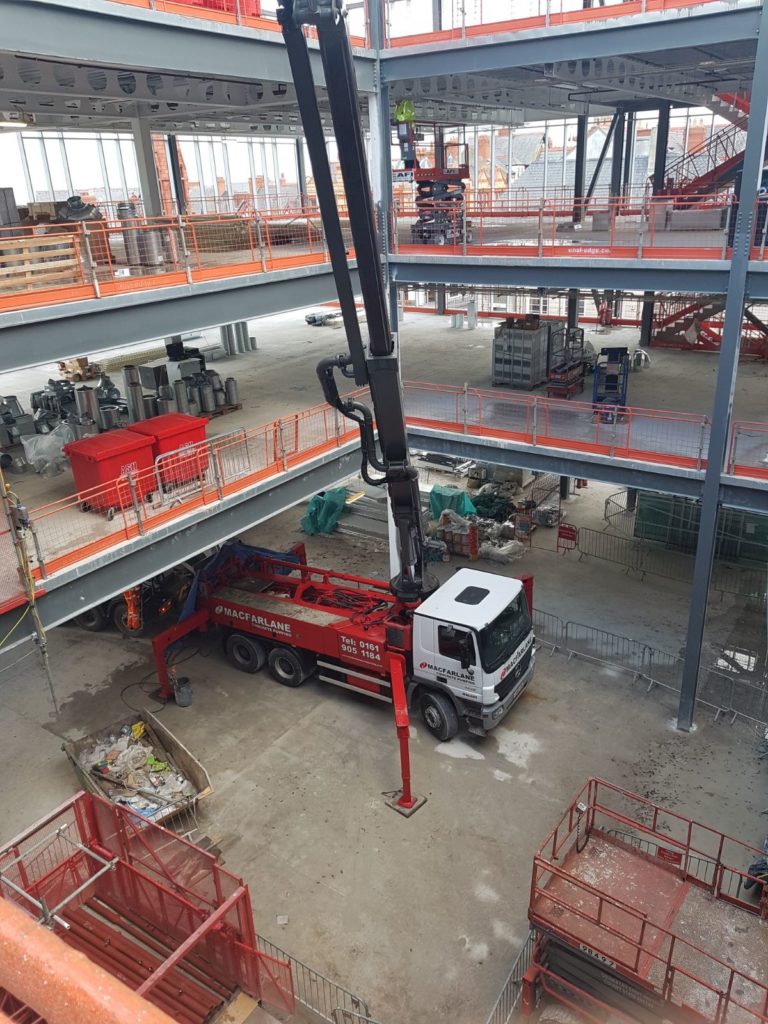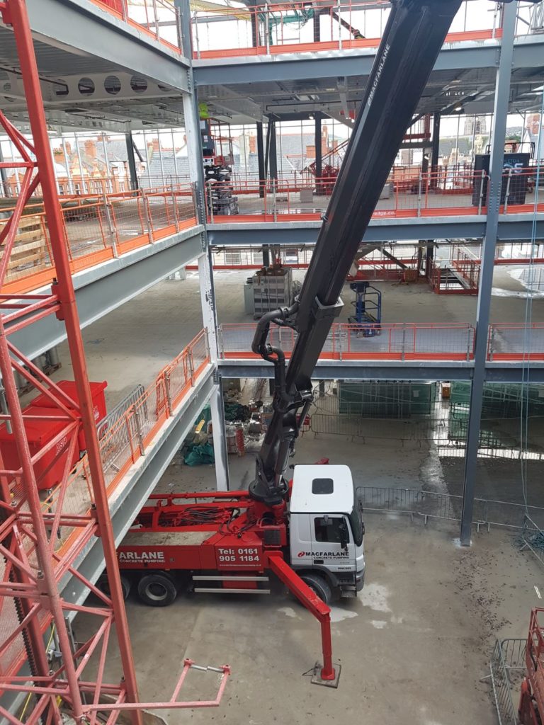 The machine used was the 31HT Telescopic Truck Mounted Concrete Pump as we needed to reach up through the purlins and access the slabs at the top of the building.